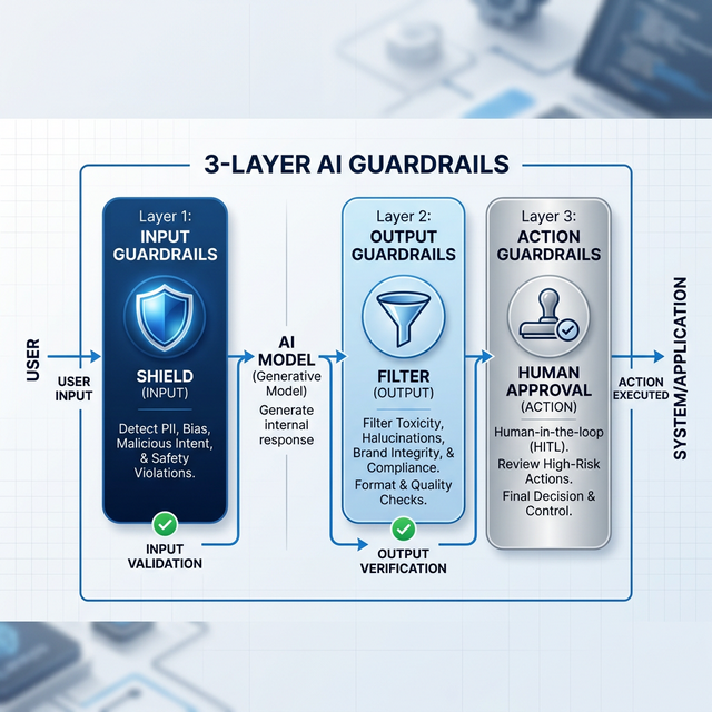 AIが実験室を脱出して、実際の運営環境(CRMアップデート、決済など)に投入されると、データ流出や誤ったアクションなどのリスクが発生します。したがって、規制遵守とセキュリティのための、強力な 「三重ガードレール」 のアーキテクチャが必須です。
